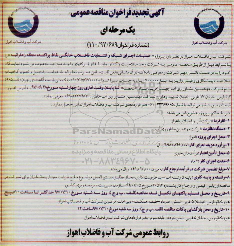 شرکت آب و فاضلاب اهواز در نظر دارد پروژه عملیات اجرای شبکه و انشعابات فاضلاب خانگی نقاط پراکنده منطقه زعفرانیه را با شرایط از طریق مناقصه عمومی به شرکت واجد صلاحیت واگذار نماید لذا از شرکت های واجد صلاحیت دعوت می شود نمایندگان خود را با در دست داشتن مهر شرکت و معرفی نامه که در آن نشانی تلفن ثابت، تلفن همراه و نمابر قید شده است اصل و تصویر گواهینامه صلاحیت پیمانکاری و فیش واریز به مبلغ 700.000 ریال به حساب سیبا به شماره 0105155272002 بان ملی شعبه آناهیتای تهران کد 965 بنام شرکت مهندسین مشاور ری آب جهت خرید اسناد مناقصه تا پایان وقت اداری روز چهارشنبه مورخ 97.6.28 به آدرس اهواز -  کیانپارس، خیابان 17 غربی، خیابان شهید وهابی، شرکت مهندسین مشاور ری آب تلفن 33374823-061 معرفی نمایند