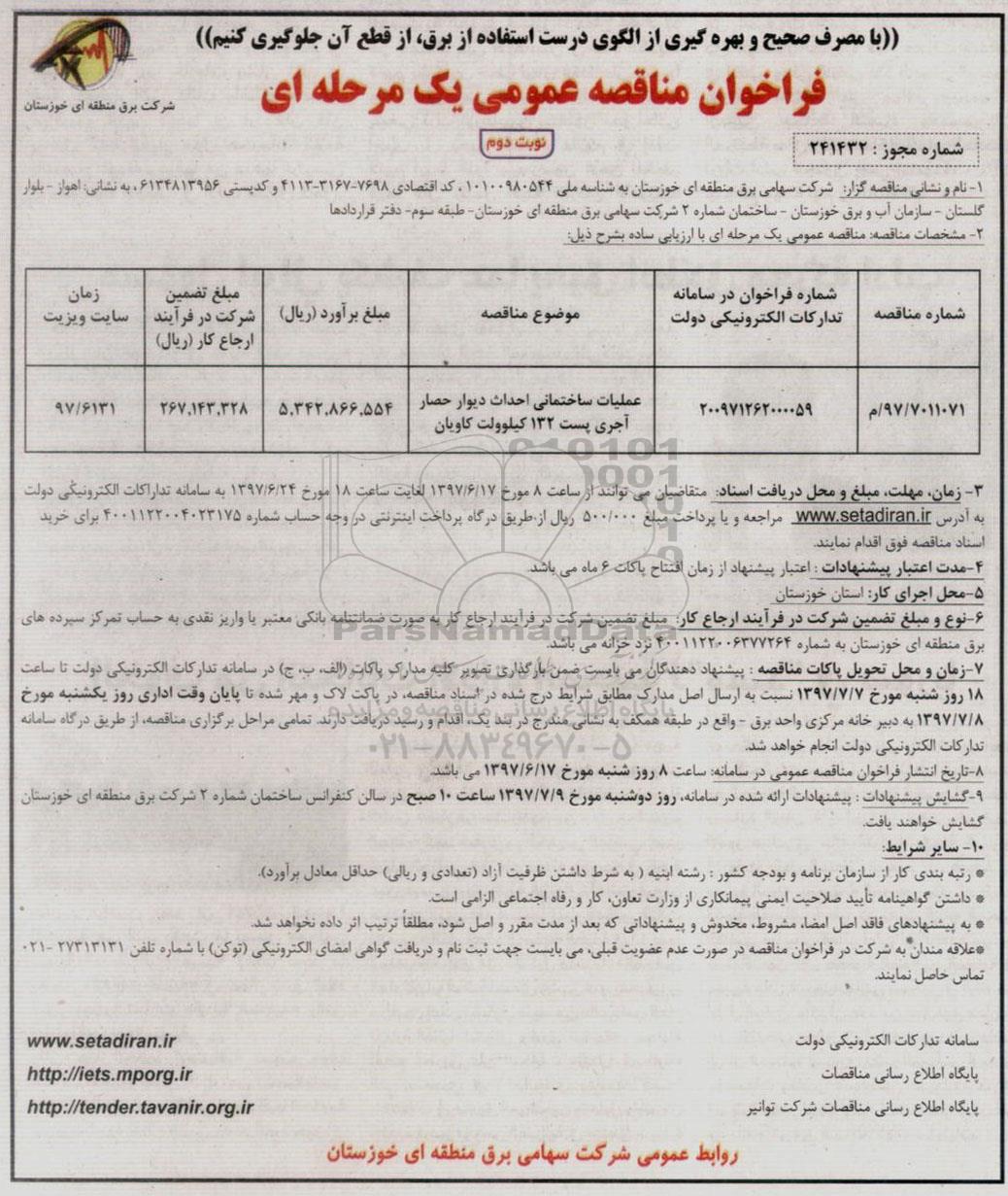 | 97/7011071/م | 200971262000059 | عملیات ساختمانی احداث دیوار حصار آجری پست 132 کیلوولت کاویان |