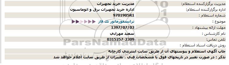 اداره برگزارکننده استعلام: اداره خرید تجهیزات برق و اتوماسیون