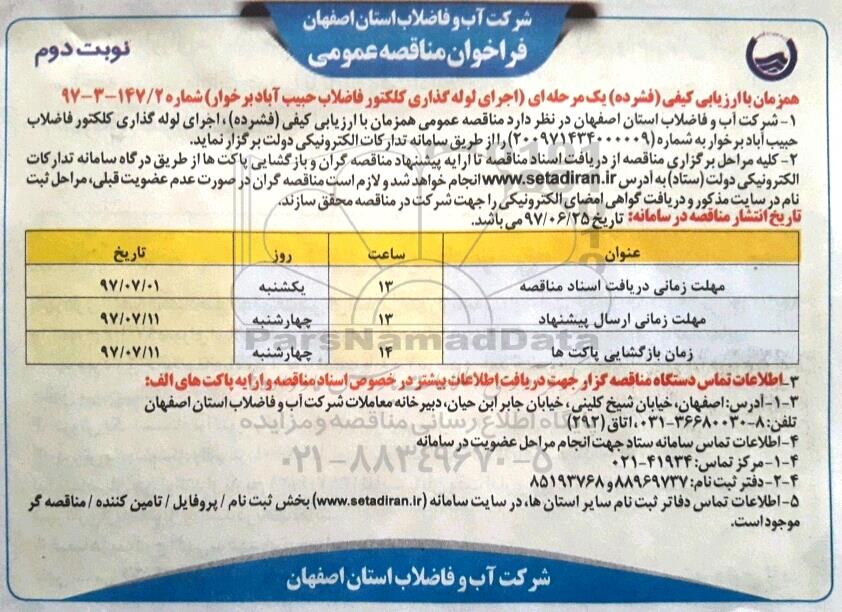 همزمان با ارزیابی کیفی (فشرده) یک مرحله ای اجرای لوله گذاری کلکتور فاضلاب حبیب آباد برخوار شماره 2/ 147-3-97