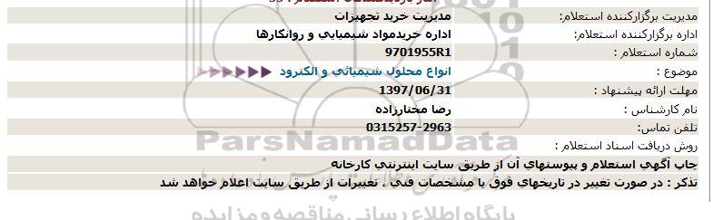 اداره برگزارکننده استعلام: اداره خرید مواد شیمیایی و روانکارها