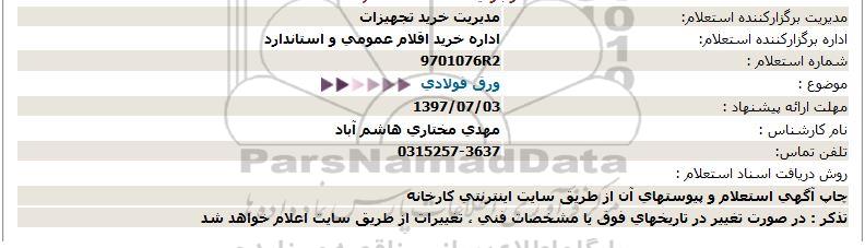 استعلام بها و موضوع استعلام استعلام, استعلام ورق فولادی به اطلاع کلیه شرکتها و افراد متخصص واجد شرایط میرساند، آگهی گذار در نظر دارد از طریق استعلام بها، نسبت به انتخاب و دریافت پیشنهادات اقدام نماید. این استعلام با کد آگهی ثبت شده در سامانه خبرگزاری پارس نماد : 1307110 منتشر شده است. مشخصات استعلام : تاریخ شروع استعلام: 1397/07/01 آخرین مهلت ارسال پیشنهاد قیمت : 1397/07/03 و محل اجرای پروژه : استان اصفهان میباشد. استعلام قیمت مورد درخواست : استعلام, استعلام ورق فولادی با دستهبندیهای تخصصی و گروه های مرتبط : آهن آلات, انواع ورق, استعلام اطلاع رسانی میگردد.