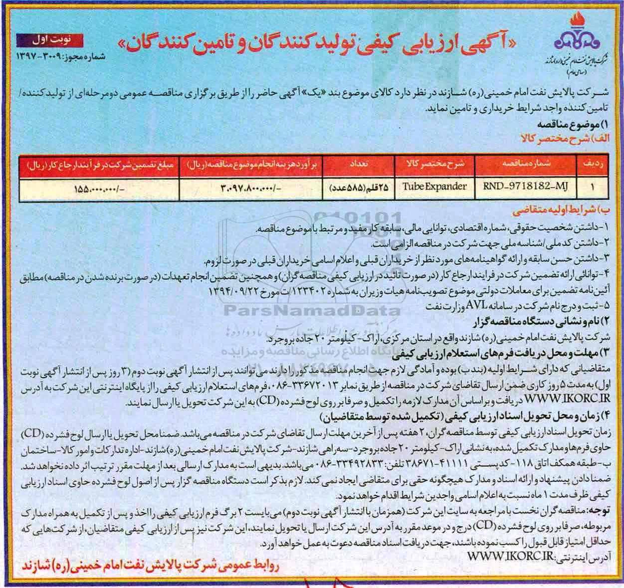 متقاضیانی که دارای شرایط اولیه بند ب بوده و آمادگی لازم جهت انجام هر یک از مناقصات مذکور را دارند می توانند پس از انتشار آگهی نوبت دوم (3 روز پس از انتشار آگهی نوبت اول) به مدت 5 روز کاری ضمن ارسال تقاضای شرکت در مناقصه را از طریق نمابر 33672013-086 فرمهای استعلام ارزیابی کیفی را از پایگاه اینترنتی این شرکت به آدرس WWW.IKORC.IR دریافت و بر اساس آن مدارک لازمه را تکمیل و صرفا بر روی لوح فشرده CD به این شرکت ارسال نمایند.