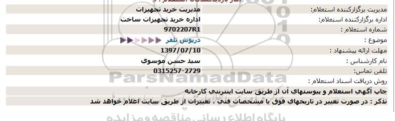 اداره برگزارکننده استعلام: اداره خرید تجهیزات ساخت