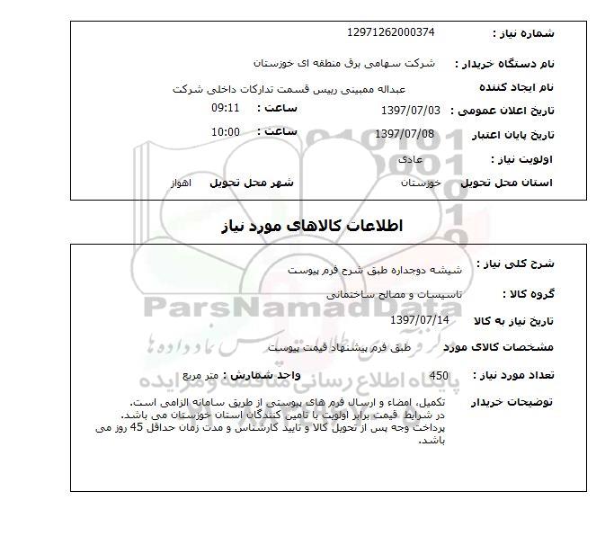 شرح کلی نیاز: شیشه دو جداره طبق شرح فرم پیوست