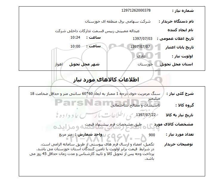 شرح کلی نیاز: سنگ مرمرریت خوی درجه یک ممتاز به ابعاد 60*60 سانتی متر و حداقل ضخامت 18 میلیمتر