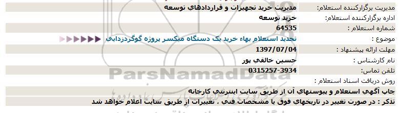 موضوع : تجدید استعلام بهاء خرید یک دستگاه میکسر پروژه گوگردزدایی