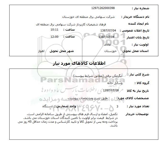 نام دستگاه خریدار: شرکت سهامی برق منطقه ای خوزستان