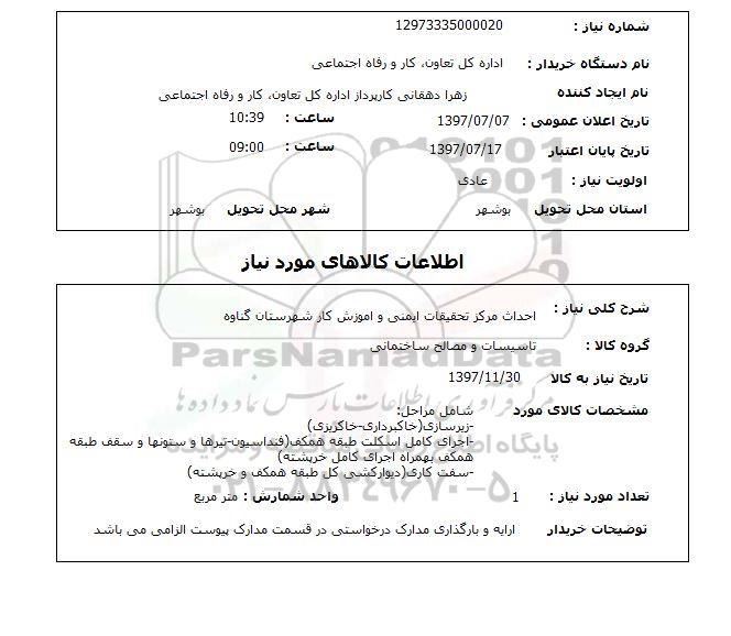 شرح کلی نیاز: احداث مرکز تحقیقات ایمنی و آموزش کار شهرستان گناوه