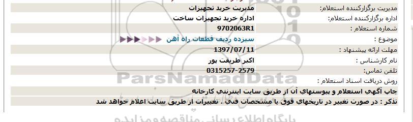 استعلام بها و موضوع استعلام استعلام, استعلام سیزده ردیف قطعات راه آهن به اطلاع کلیه شرکتها و افراد متخصص واجد شرایط میرساند، آگهی گذار در نظر دارد از طریق استعلام بها، نسبت به انتخاب و دریافت پیشنهادات اقدام نماید. این استعلام با کد آگهی ثبت شده در سامانه خبرگزاری پارس نماد : 1314742 منتشر شده است. مشخصات استعلام : تاریخ شروع استعلام: 1397/07/07 آخرین مهلت ارسال پیشنهاد قیمت : 1397/07/11 و محل اجرای پروژه : استان اصفهان میباشد. استعلام قیمت مورد درخواست : استعلام, استعلام سیزده ردیف قطعات راه آهن با دستهبندیهای تخصصی و گروه های مرتبط : راه آهن, استعلام اطلاع رسانی میگردد.