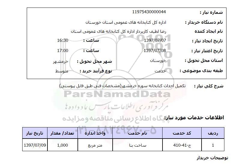 شرح کلی نیاز: تکمیل احداث کتابخانه سوره خرمشهر (مشخصات فنی طبق فایل پیوستی)