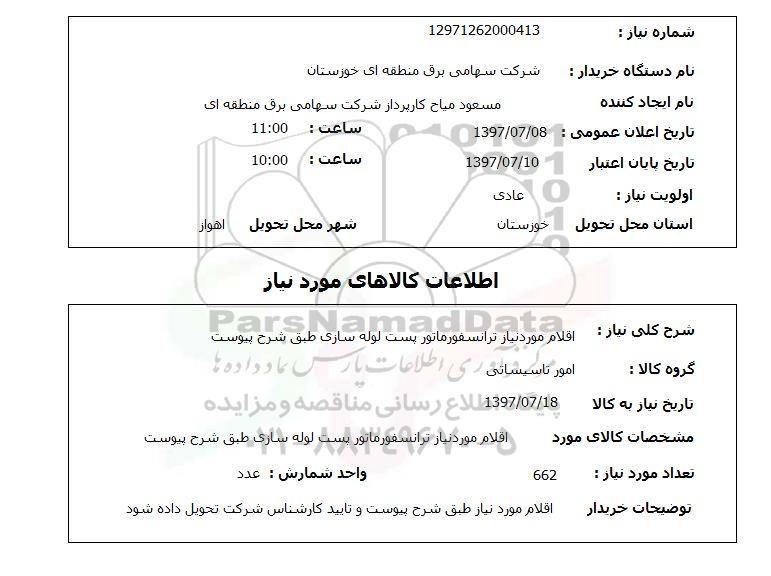 شرح کلی نیاز: اقلام مورد نیاز ترانسفورماتور پست لوله سازی طبق شرح پیوست