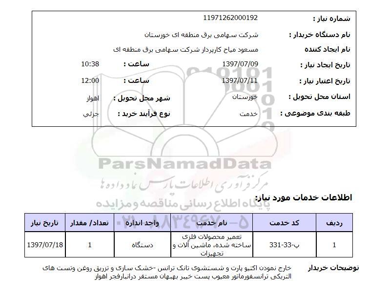 | 1 | پ-33-331 | تعمیر محصولات فلزی ساخته شده، ماشین الات و تجهیزات | دستگاه | 1 | 1397.07.18 |