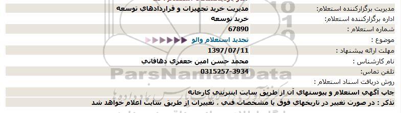 استعلام بها و موضوع استعلام استعلام والو تجدید به اطلاع کلیه شرکتها و افراد متخصص واجد شرایط میرساند، آگهی گذار در نظر دارد از طریق استعلام بها، نسبت به انتخاب و دریافت پیشنهادات اقدام نماید. این استعلام با کد آگهی ثبت شده در سامانه خبرگزاری پارس نماد : 1317885 منتشر شده است. مشخصات استعلام : تاریخ شروع استعلام: 1397/07/09 آخرین مهلت ارسال پیشنهاد قیمت : 1397/07/11 و محل اجرای پروژه : استان اصفهان میباشد. استعلام قیمت مورد درخواست : استعلام والو تجدید با دستهبندیهای تخصصی و گروه های مرتبط : شیرآلات, استعلام اطلاع رسانی میگردد.