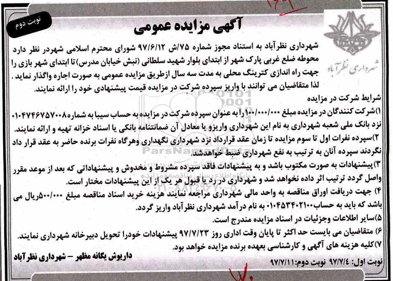 شهرداری نظرآباد در نظر دارد محوطه ضلع غربی پارک شهر از ابتدای بلوار شهید سلطانی نبش خیابان مدرس تا ابتدای شهربازی را جهت راه اندازی کترینگ محلی به مدت سه سال از طریق مزایده عمومی به صورت اجاره واگذار نماید.