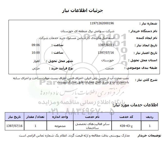 شرح کلی نیاز: نصب مخزن آب از جنس پلی اتیلن - اجرای فنس اطراف پست موقت، ساخت و اجرای سایه بان مخزن آب و شرح کامل عملیات طب مدارک پیوست