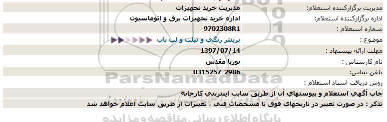 استعلام بها و موضوع استعلام استعلام, استعلام پرینتر رنگی و تبلت و لپ تاپ به اطلاع کلیه شرکتها و افراد متخصص واجد شرایط میرساند، آگهی گذار در نظر دارد از طریق استعلام بها، نسبت به انتخاب و دریافت پیشنهادات اقدام نماید. این استعلام با کد آگهی ثبت شده در سامانه خبرگزاری پارس نماد : 1321231 منتشر شده است. مشخصات استعلام : تاریخ شروع استعلام: 1397/07/11 آخرین مهلت ارسال پیشنهاد قیمت : 1397/07/14 و محل اجرای پروژه : استان اصفهان میباشد. استعلام قیمت مورد درخواست : استعلام, استعلام پرینتر رنگی و تبلت و لپ تاپ با دستهبندیهای تخصصی و گروه های مرتبط : کامپیوتر, نوت بوک, ماشین اداری, تجهیزات مخابرات, استعلام اطلاع رسانی میگردد.
