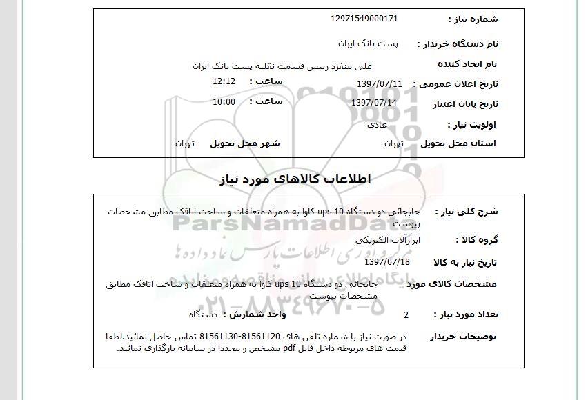 مشخصات کالای مورد:جابجایی دو دستگاه ups 10 کاوا به همراه متعلقات و ساخت اتاقک مطابق مشخصات پیوست