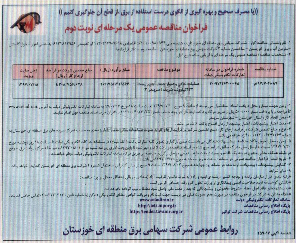 6- تاریخ انتشار فراخوان مناقصه عمومی در سامانه ساعت 8 روز سه شنبه مورخ 97.7.10 می باشد