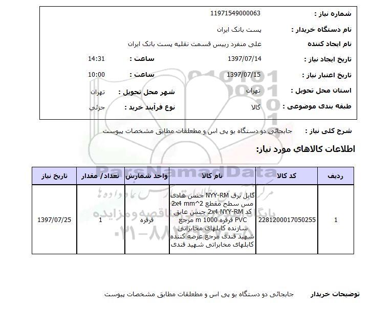شرح کلی نیاز: جابجایی دو دستگاه یو پی اس و متعلقات مطابق مشخصات پیوست