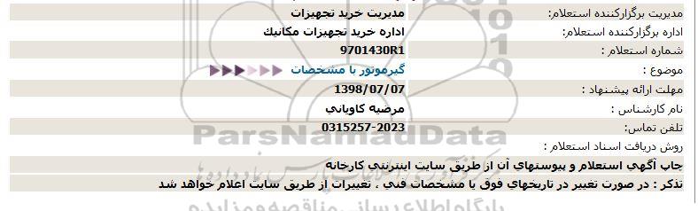 اداره برگزارکننده استعلام: اداره خرید تجهیزات مکانیک