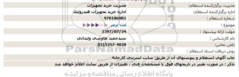 اداره برگزارکننده استعلام:  اداره خرید تجهیزات هیدرولیک