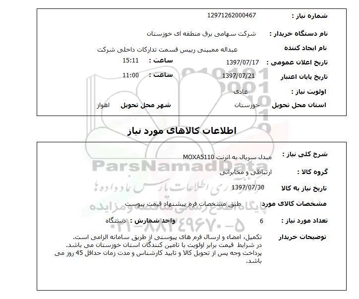 نام دستگاه خریدار: شرکت سهامی برق منطقه ای خوزستان