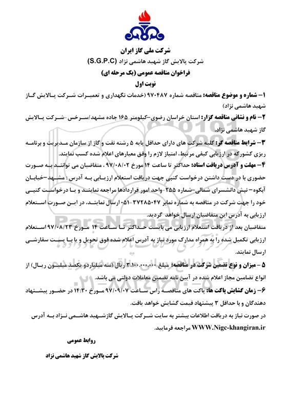 شماره و موضوع مناقصه شماره 970487 خدمات نگهداری و تعمیرات شرکت پالایش گاز شهید هاشمی نژاد