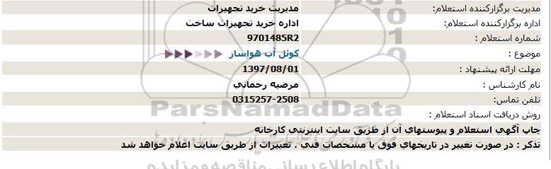 استعلام بها و موضوع استعلام استعلام , استعلام کوئل آب هواساز به اطلاع کلیه شرکتها و افراد متخصص واجد شرایط میرساند، آگهی گذار در نظر دارد از طریق استعلام بها، نسبت به انتخاب و دریافت پیشنهادات اقدام نماید. این استعلام با کد آگهی ثبت شده در سامانه خبرگزاری پارس نماد : 1339051 منتشر شده است. مشخصات استعلام : تاریخ شروع استعلام: 1397/07/24 آخرین مهلت ارسال پیشنهاد قیمت : 1397/08/01 و محل اجرای پروژه : استان اصفهان میباشد. استعلام قیمت مورد درخواست : استعلام , استعلام کوئل آب هواساز با دستهبندیهای تخصصی و گروه های مرتبط : تاسیسات ساختمانی, سیستم تهویه و هواکشی صنعتی, استعلام اطلاع رسانی میگردد.
