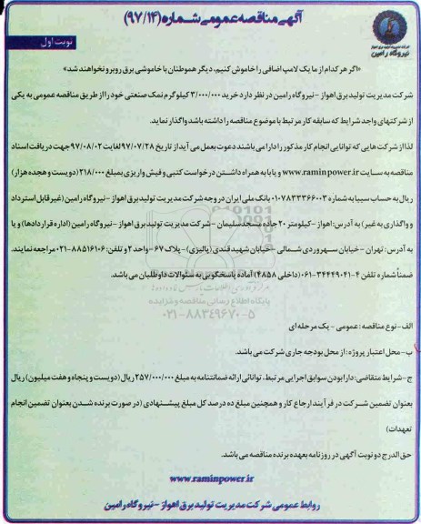 شرکت مدیریت تولید برق اهواز - نیروگاه رامین در نظر دارد خرید 3.000.000 کیلوگرم نمک صنعتی خود را از طریق مناقصه عمومی به یکی از شرکت های واجدشرایط که سابقه کار مرتبط با موضوع مناقصه را داشته باشد واگذار نماید.