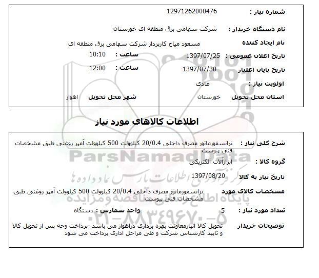 نام دستگاه خریدار: شرکت سهامی برق منطقه ای خوزستان