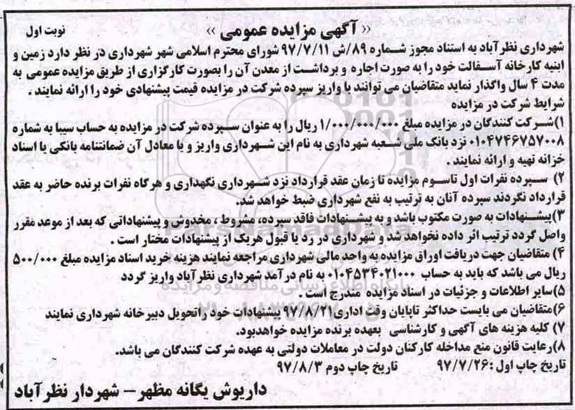 شهرداری نظرآباد در نظر دارد زمین و ابنیه کارخانه آسفالت خود را به صورت اجاره و برداشت از معدن آن را به صورت کارگزاری از طریق مزایده عمومی به مدت 4 سال واگذار نماید. متقاضیان می توانند با واریز سپرده شرکت در مزایده قیمت پینشهادی خود را ارائه نمایند