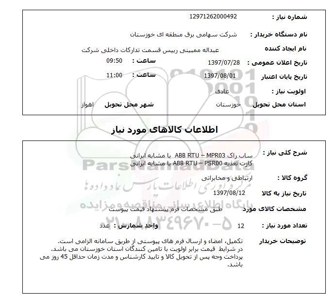 شرح کلی نیاز: ساب راک ABB RTU - MPR03 یا مشابه ایرانی