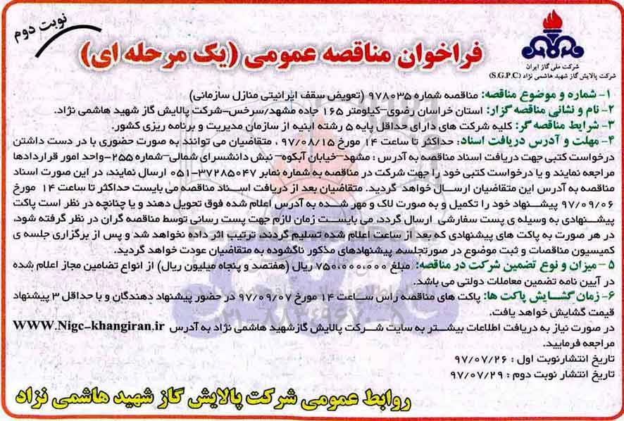 1- شماره و موضوع مناقصه مناقصه شماره 978035 تعویض سقف ایرانیتی منازل سازمانی