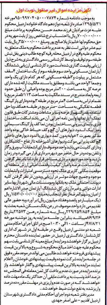 مزایده ششدانگ آپارتمان مساحت عرصه کل 200 متر کلاسه 95099704050007874