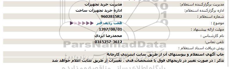 اداره برگزارکننده استعلام:اداره خرید تجهیزات ساخت