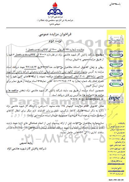 موضوع: شرکت پالایش گاز شهید هاشمی نژاد در نظردارد فروش 700 تن کاتالیست مستعمل خود را از طریق مزایده عمومی به فروش برساند.