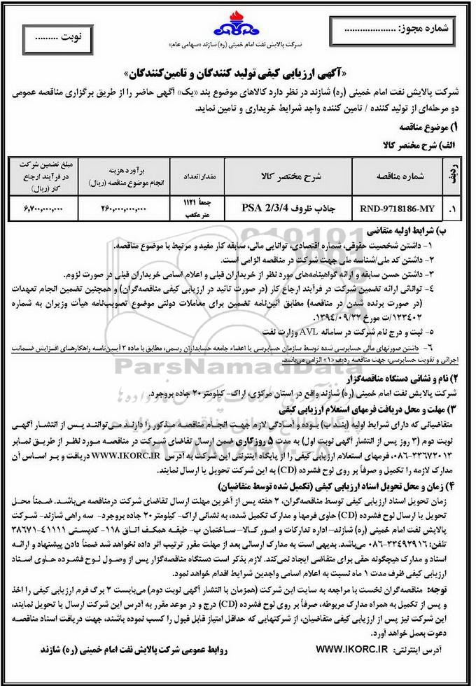2- نام و نشانی دستگاه مناقصه گزار : شرکت پالایش نفت امام خمینی ره شازند واقع در استان مرکزی ، اراک ، کیلومتر 20 جاده بروجرد