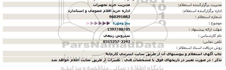 اداره برگزارکننده استعلام: اداره خرید اقلام عمومی و استاندارد