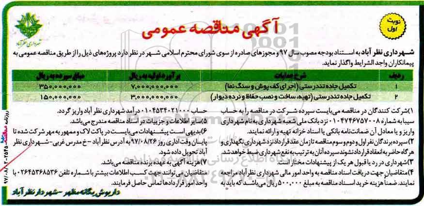 شهرداری نظرآباد در نظر دارد پروژه های ذیل را از طریق مناقصه عمومی به پیمانکاران واجد شرایط واگذار نماید.