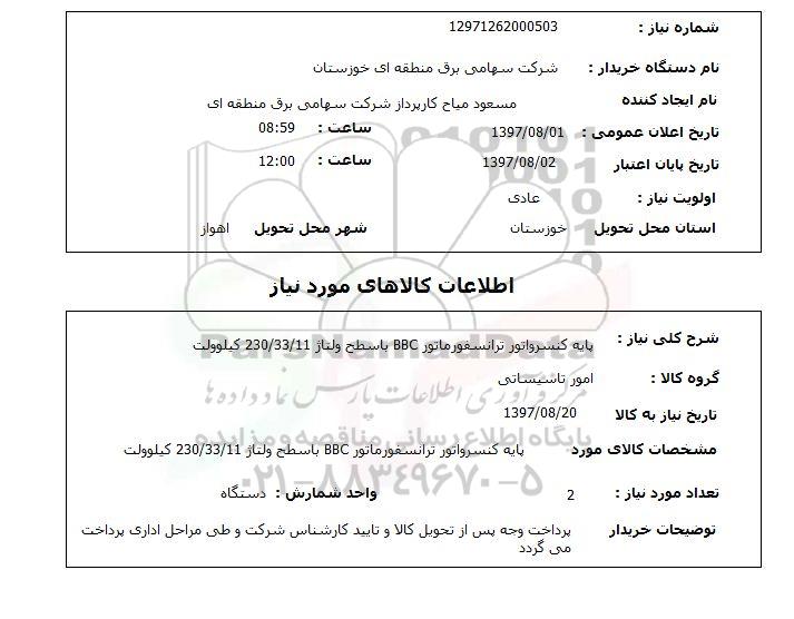 استعلام پایه کنسرواتور ترانسفورماتور BBC , استعلام, پایه کنسرواتور ترانسفورماتور BBC