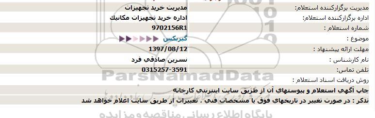 استعلام بها و موضوع استعلام استعلام, استعلام گیربکس به اطلاع کلیه شرکتها و افراد متخصص واجد شرایط میرساند، آگهی گذار در نظر دارد از طریق استعلام بها، نسبت به انتخاب و دریافت پیشنهادات اقدام نماید. این استعلام با کد آگهی ثبت شده در سامانه خبرگزاری پارس نماد : 1350710 منتشر شده است. مشخصات استعلام : تاریخ شروع استعلام: 1397/08/03 آخرین مهلت ارسال پیشنهاد قیمت : 1397/08/12 و محل اجرای پروژه : استان اصفهان میباشد. استعلام قیمت مورد درخواست : استعلام, استعلام گیربکس با دستهبندیهای تخصصی و گروه های مرتبط : تجهیزات و ماشین آلات صنعتی, استعلام اطلاع رسانی میگردد.
