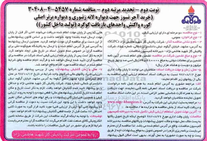 7- محل و زمان گشایش پیشنهادات: پس از بررسی پیشنهاد فنی شرکت ها ارزیابی فنی پاکتهای مالی شرکت های واجد شرایط در تاریخ 97.10.12 در محل اتاق کنفرانس اداره مشهد دفتر آبکوه به آدرس مشهد خیابان آبکوه نبش دانشسرای شمالی شماره 255 شرکت پالایش گاز شهید هاشمی نژاد و حداقل با دو پیشنهاد تایید شده گشایش خواهد یافت لازم به ذکر است تا تاریخ و مکان اعلام شده تاریخ گشایش پیشنهادهای مالی قطعی نبوده و با توجه به روند ارزیابی فنی پیشنهادات و رفع ابهام های احتمالی امکان تغییر وجود خواهد داشت با این وجود این شرکت نسبت به دعوت از مناقصه گرانی که پیشنهاد فنی آنها پس از ارزیابی فنی مورد تایید قرار گیرد به صورت کتبی حداقل 72 ساعت قبل از جلسه قطعی گشایش پیشنهادات اقدام خواهد نمود