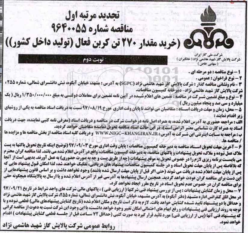 تجدید مناقصه خرید مقدار 270 تن کربن فعال - نوبت دوم از کلیه افراد متخصص و شرکتها واجد شرایط دعوت به عمل میآید در مناقصه با کد خبرگزاری پارس نماد: 1351389 شرکت نمایند.