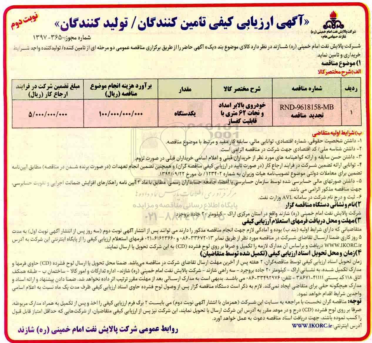 شرکت پالایش نفت امام خمینی ره شازند در نظر دارد کالاهای موضوع بند یک آگهی حاضر را از طریق برگزاری مناقصه عمومی دو مرحله ای از تامین کننده/ تولید کننده واجد شرایط خریداری و تامین نماید.