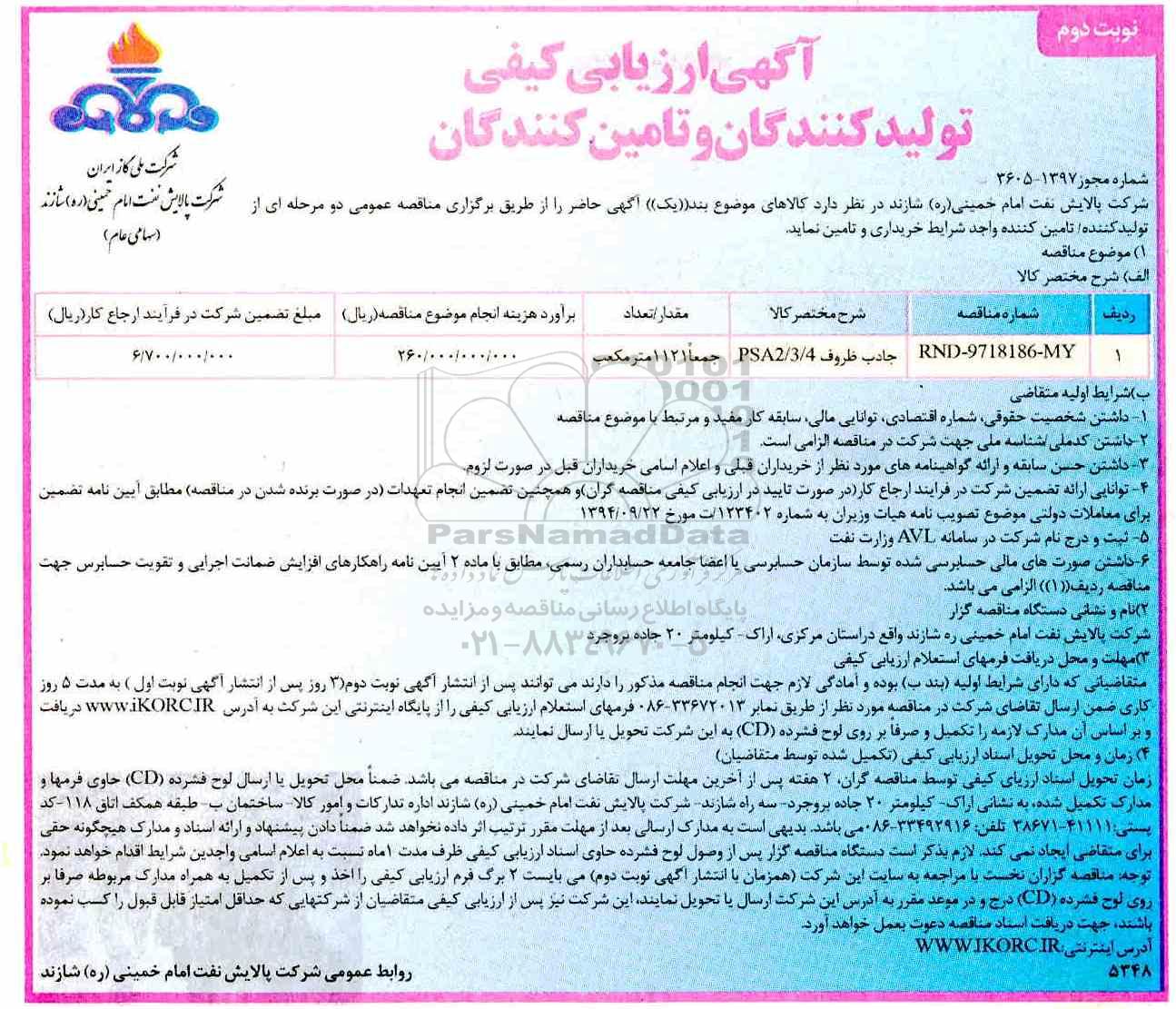 ارزیابی کیفی جاذب ظروف - نوبت دوم از کلیه افراد متخصص و شرکتها واجد شرایط دعوت به عمل میآید در مناقصه با کد خبرگزاری پارس نماد: 1353038 شرکت نمایند.