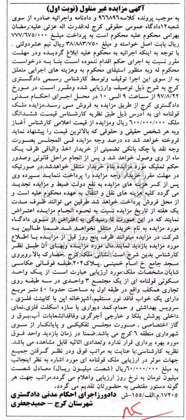 مزایده یک واحد مسکونی 40 مترمربع کلاسه 966896 نوبت اول