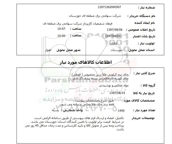 مشخصات کالای مورد : طبق شرح و مشخصات پیوست. فقط برند چای طلا و مانی پذیرفته می شود.