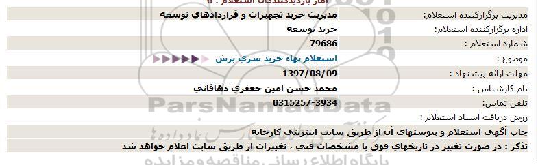 استعلام بها و موضوع استعلام استعلام , استعلام خرید سری برش به اطلاع کلیه شرکتها و افراد متخصص واجد شرایط میرساند، آگهی گذار در نظر دارد از طریق استعلام بها، نسبت به انتخاب و دریافت پیشنهادات اقدام نماید. این استعلام با کد آگهی ثبت شده در سامانه خبرگزاری پارس نماد : 1355802 منتشر شده است. مشخصات استعلام : تاریخ شروع استعلام: 1397/08/07 آخرین مهلت ارسال پیشنهاد قیمت : 1397/08/09 و محل اجرای پروژه : استان اصفهان میباشد. استعلام قیمت مورد درخواست : استعلام , استعلام خرید سری برش با دستهبندیهای تخصصی و گروه های مرتبط : دستگاه جوش و برش, تجهیزات و ماشین آلات صنعتی, استعلام اطلاع رسانی میگردد.