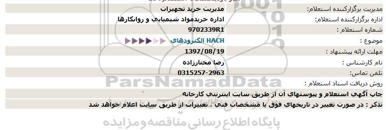 استعلام بها و موضوع استعلام استعلام, استعلام الکترودهای HACH به اطلاع کلیه شرکتها و افراد متخصص واجد شرایط میرساند، آگهی گذار در نظر دارد از طریق استعلام بها، نسبت به انتخاب و دریافت پیشنهادات اقدام نماید. این استعلام با کد آگهی ثبت شده در سامانه خبرگزاری پارس نماد : 1357615 منتشر شده است. مشخصات استعلام : تاریخ شروع استعلام: 1397/08/09 آخرین مهلت ارسال پیشنهاد قیمت : 1397/08/19 و محل اجرای پروژه : استان اصفهان میباشد. استعلام قیمت مورد درخواست : استعلام, استعلام الکترودهای HACH با دستهبندیهای تخصصی و گروه های مرتبط : الکترود, خدمات و تجهیزات آزمایشگاهی و پزشکی, استعلام اطلاع رسانی میگردد.